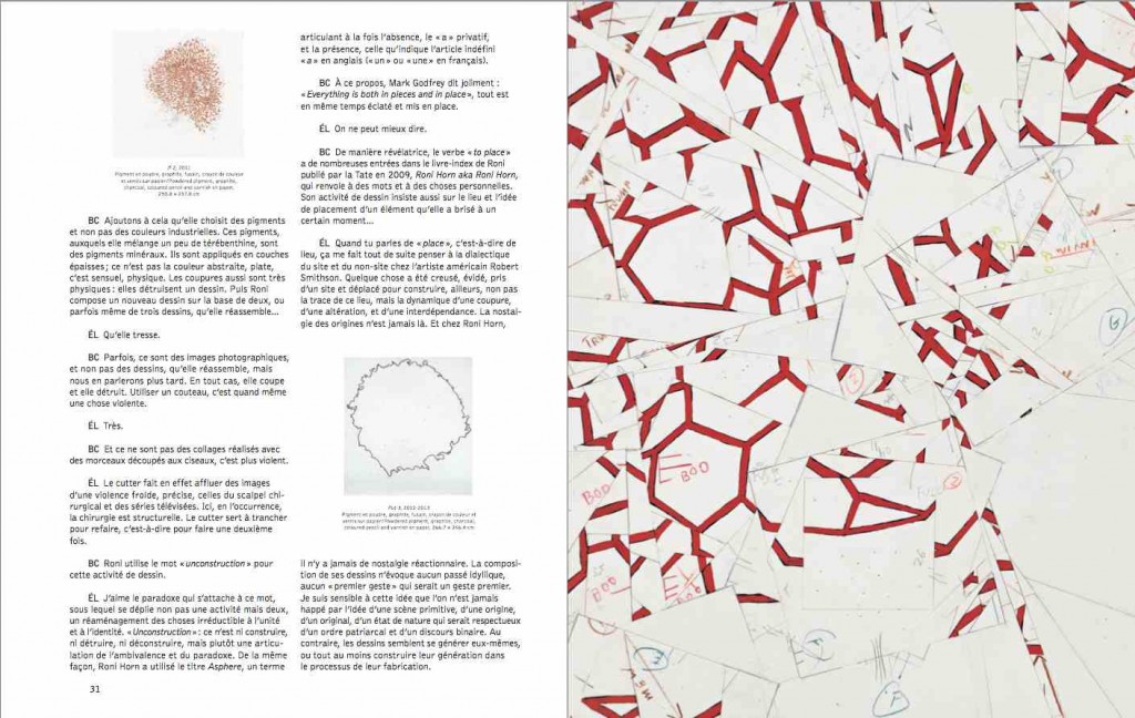 « C’est dans ce travail du trait que se trouve le point de rencontre entre les expositions « Butterfly to Oblivion » et « Les dessins de Van Gogh : influences et innovations », qui se tiennent en parallèle. Le dessin constitue l’activité de base du travail artistique de Roni Horn qui, se servant de la technique des cut up, semble fonder sa recherche sur un questionnement : comment le mouvement et la stimulation naissent-ils sur une surface ? Cette recherche, entreprise avec des moyens inhabituels, l’artiste la poursuit dans l’espace et le langage. »